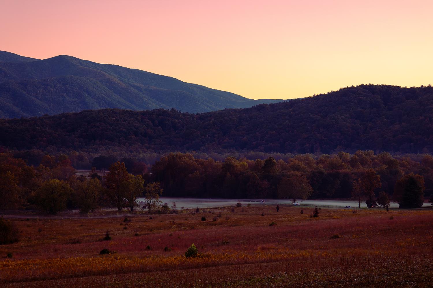 Golden hour sunset captured at Cades Cove, Great Smoky Mountains National Park in October.