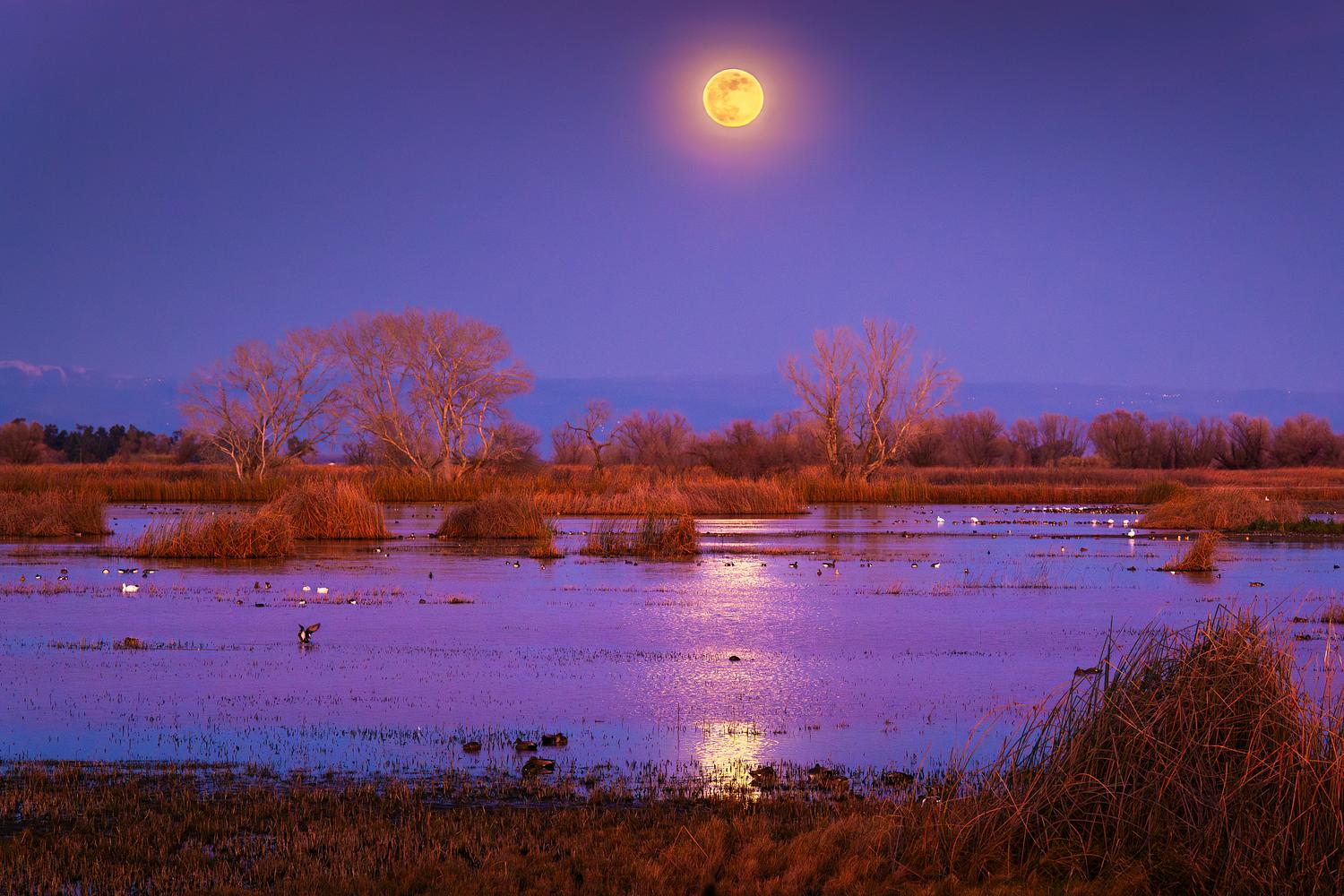 A full moon casts its glow over the marsh of Sacramento National Wildlife Refuge.
