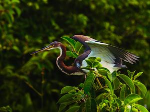 A tricolored heron spreads its wings before flight at the Wakodahatchee Wetlands.