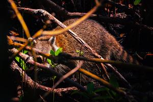 A mother raccoon watches over her cubs as they scour the forest floor of the Gumbo Limbo.