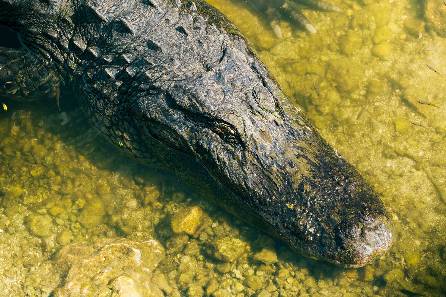 A full grown American alligator naps on the rocky banks of Big Cypress Oasis Visitor Center.