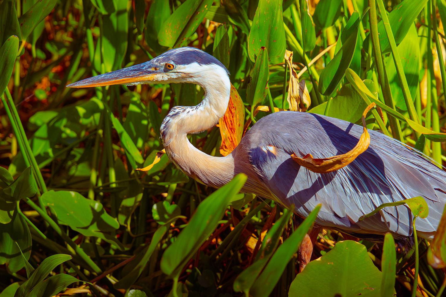 A great blue heron stalks the lilies at the Wakodahatchee Wetlands.
