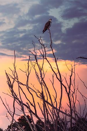 An osprey perched at Flamingo overlooks the Florida Bay sunset.