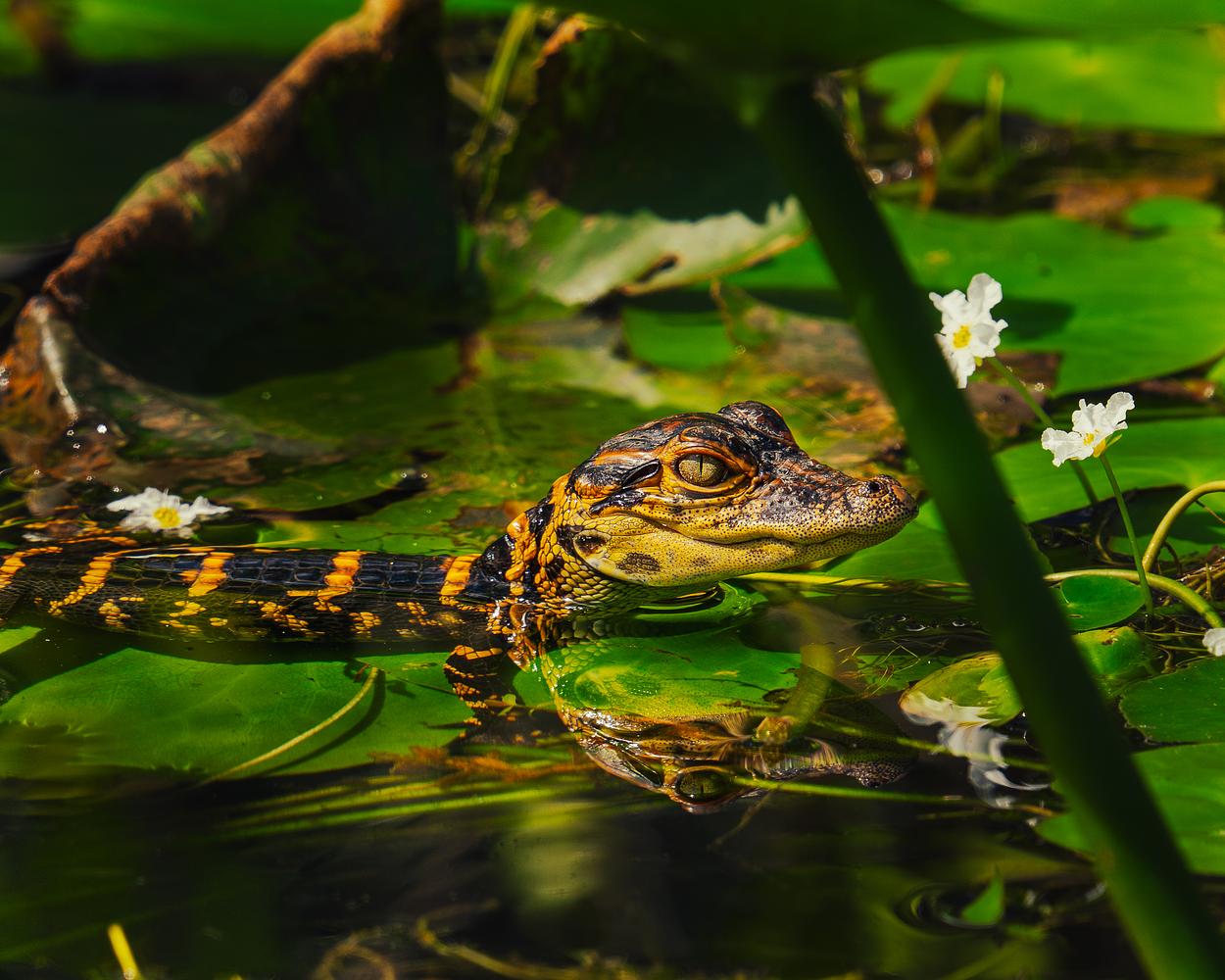 A hatchling American alligator peeks over the lily pads of the Everglades.