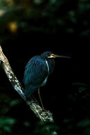 A tri-colored heron sits perched underneath the dark canopies of Big Cypress.