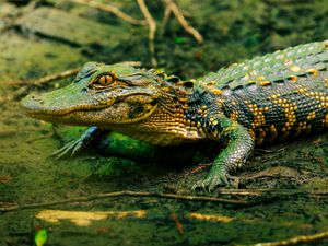 An adolescent alligator lies in the muddied algae at Fakahatchee Strand Preserve State Park.