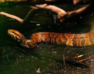 A cottonmouth slithers through the muddied banks of a pond at Fakahatchee Strand Preserve State Park.