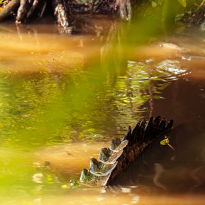 The dorsal scutes of an American alligator slice the water's surface at Fakahatchee Strand.