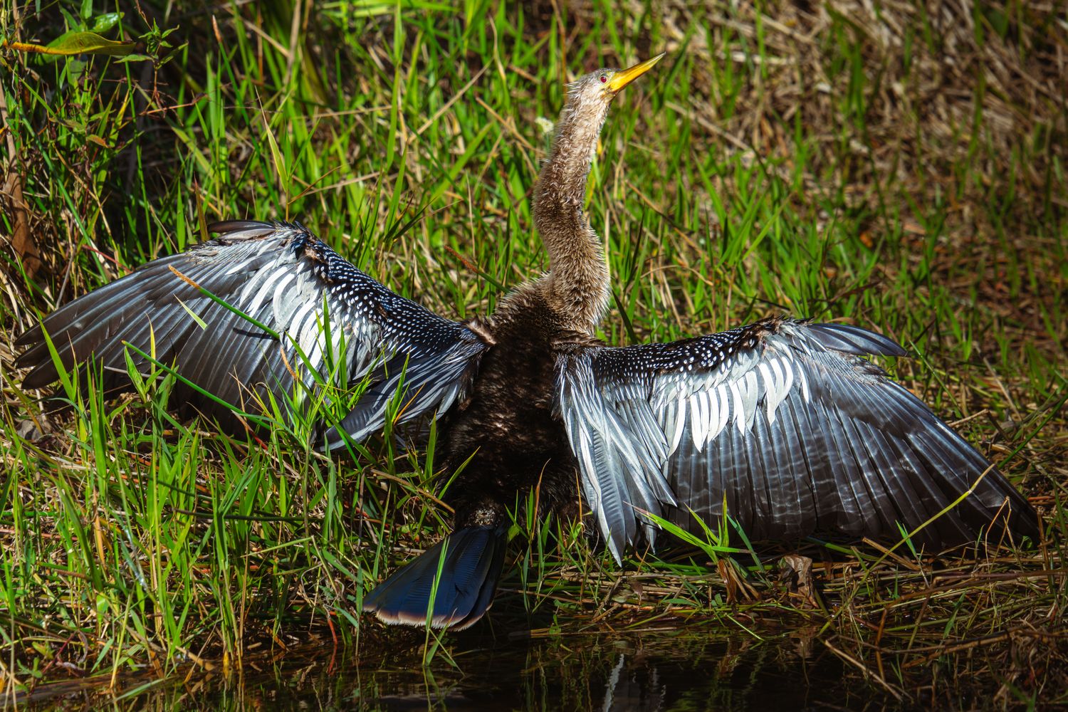 A female anhinga spreads her wings in an attempt to dry them off in the sun on the banks of a slough.