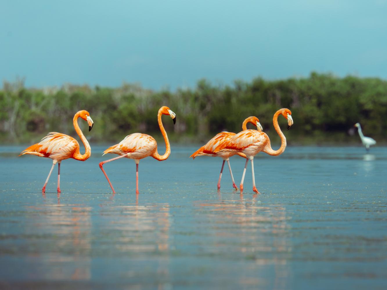 A flamboyance of American flamingos wade through the shallows of Snake Bight.