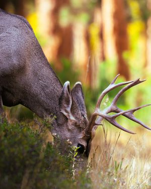 A buck mule deer grazes on a slope at Bear Lake, Rocky Mountain National Park.